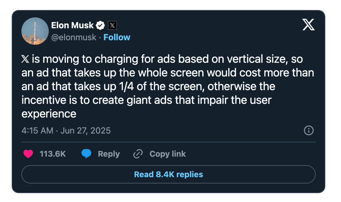 A full-screen vertical ad will cost significantly more than a smaller one. The bigger your ad, the higher the price — a move Musk says is meant to discourage giant, disruptive formats.